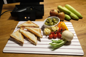 Ich kann es kaum abwarten, das Gerät mit den Kindern zu testen und probiere gleich unterschiedliche Rezepte aus. Ganz klassisch mit Käse und Schinken, etwas raffinierter mit Ziegenkäse und Avocado und schließlich noch mit Salami, Butter und Tomate.